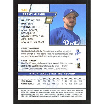 This is a 1999 Finest Jeremy Giambi baseball card. The card is #146 and pictures show condition.