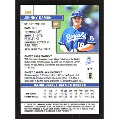 This is a 1999 Finest Johnny Damon baseball card. The card is #204 and pictures show condition.