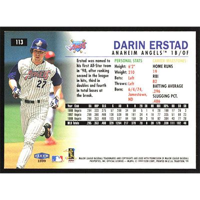 This is a 1999 Fleer Tradition Darin Erstad baseball card. The card is #113 and pictures show condition.