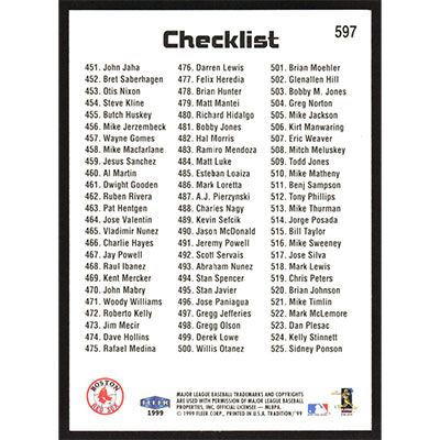 This is a 1999 Fleer Tradition Nomar Garciaparra Checklist baseball card. The card is #597 and pictures show condition.