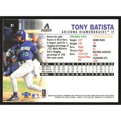 This is a 1999 Fleer Tradition Tony Batista baseball card. The card is #81 and pictures show condition.