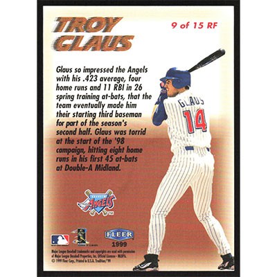 This is a 1999 Fleer Tradition Rookie Flashback Troy Glaus baseball card. The card is #9 and pictures show condition.