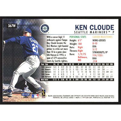 This is a 1999 Fleer Tradition Warning Track Ken Cloude baseball card. The card is #367W and pictures show condition.