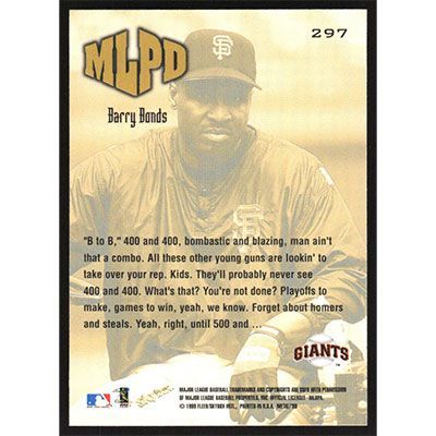 This is a 1999 Metal Universe Barry Bonds MLPD baseball card. The card is #297 and pictures show condition.