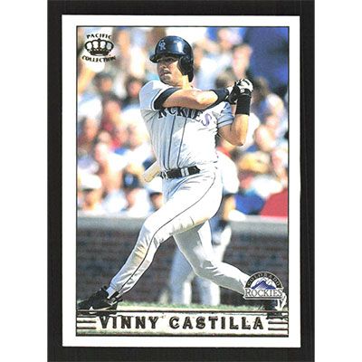 This is a 1999 Pacific Crown Collection Vinny Castilla baseball card. The card is #94 and pictures show condition.