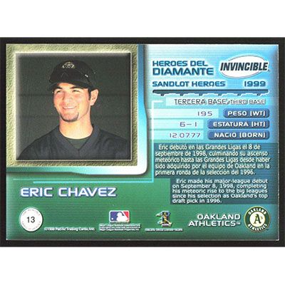 This is a 1999 Pacific Invincible Sandlot Heroes Eric Chavez baseball card. The card is #13 and pictures show condition.