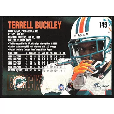 This is a 1999 SkyBox Dominion Terrell Buckley football card. The card is #149 and pictures show condition.