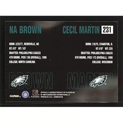 This is a 1999 SkyBox Dominion Na Brown and Cecil Martin football card. The card is #231 and pictures show condition. Team: Philadelphia Eagles Rookie Card