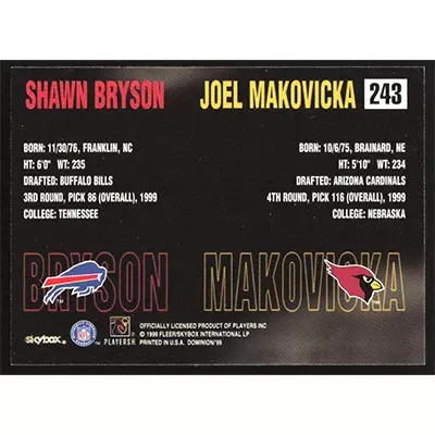 This is a 1999 SkyBox Dominion Shawn Bryson and Joel Makovicka football card. The card is #243 and pictures show condition. Team(s): Buffalo Bills/Arizona Cardinals Rookie Card (RC)