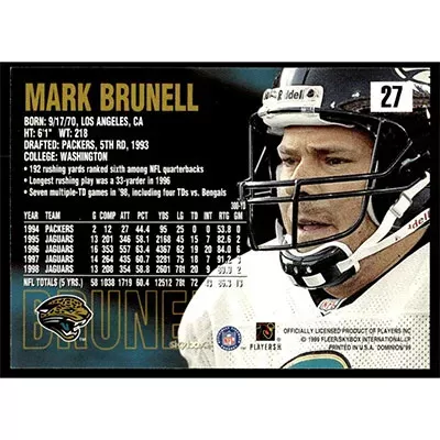 This is a 1999 SkyBox Dominion Mark Brunell football card. The card is #27 and pictures show condition.