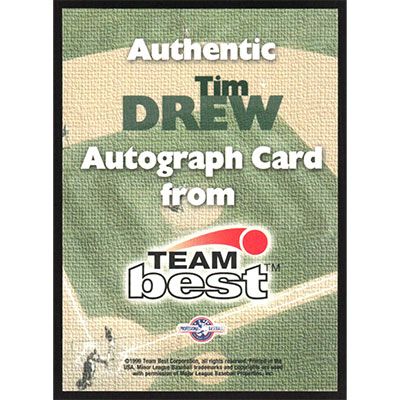 This is a 1999 Team Best Autographs Tim Drew autographed baseball card. This card has been signed, in black, by Tim Drew, and is certified authentic by Team Best. The card is #NNO and pictures show condition.