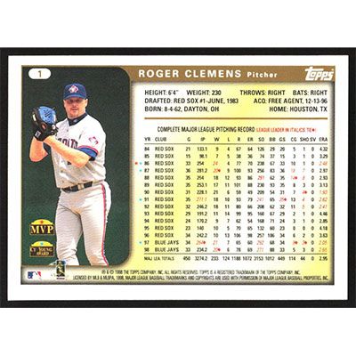 This is a 1999 Topps Roger Clemens baseball card. The card is #1 and pictures show condition.