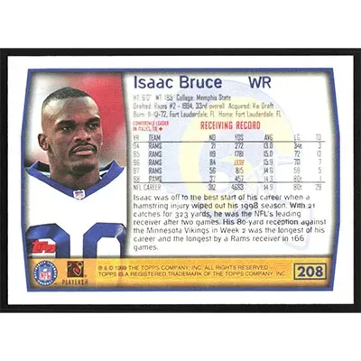 This is a 1999 Topps Isaac Bruce football card. The card is #208 and pictures show condition.