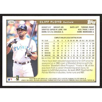 This is a 1999 Topps Cliff Floyd baseball card. The card is #296 and pictures show condition.