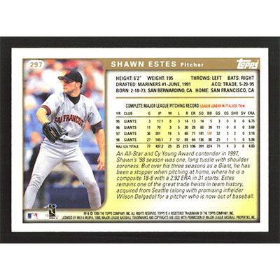 This is a 1999 Topps Shawn Estes baseball card. The card is #297 and pictures show condition.