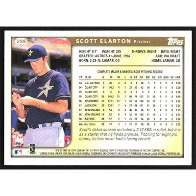 This is a 1999 Topps Scott Elarton baseball card. The card is #299 and pictures show condition.