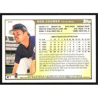This is a 1999 Topps Ron Coomer baseball card. The card is #344 and pictures show condition.