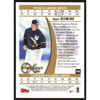 This is a 1999 Topps Roger Clemens Strikeout Kings baseball card. The card is #445 and pictures show condition.
