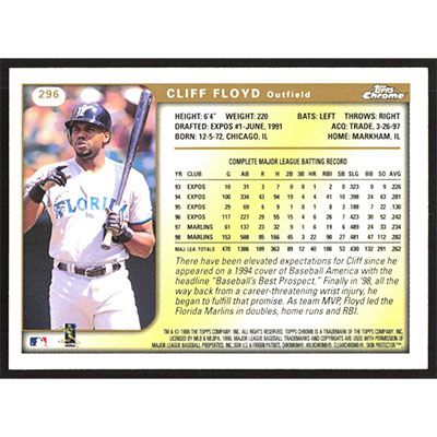This is a 1999 Topps Chrome Cliff Floyd baseball card. The card is #296 and pictures show condition.
