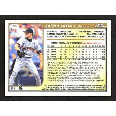 This is a 1999 Topps Chrome Shawn Estes baseball card. The card is #297 and pictures show condition.