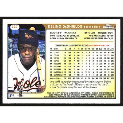 This is a 1999 Topps Chrome Delino DeShields baseball card. The card is #327 and pictures show condition.