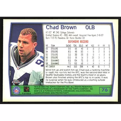 This is a 1999 Topps Chrome Chad Brown football card. The card is #76 and pictures show condition.