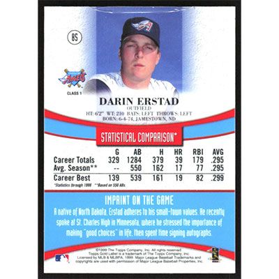 This is a 1999 Topps Gold Label Class 1 Darin Erstad baseball card. The card is #85 and pictures show condition.