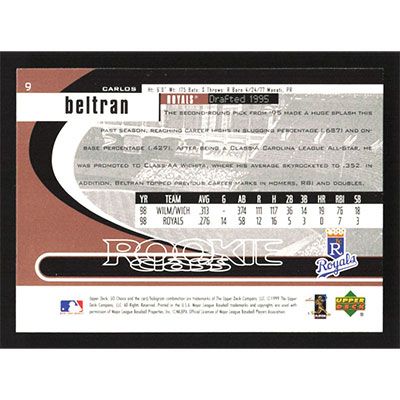 This is a 1999 UD Choice Carlos Beltran Rookie Class baseball card. The card is #9 and pictures show condition.