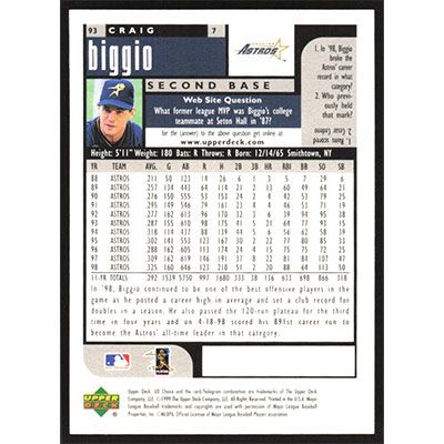 This is a 1999 UD Choice Craig Biggio baseball card. The card is #93 and pictures show condition.