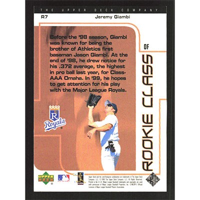 This is a 1999 UD Choice Rookie Class Jeremy Giambi baseball card. The card is #R7 and pictures show condition.