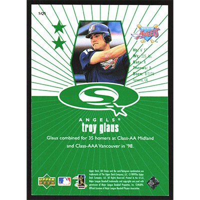 This is a 1999 UD Choice StarQuest Green Troy Glaus baseball card. The card is #SQS and pictures show condition.