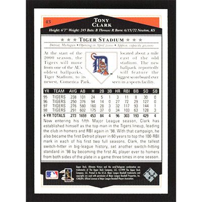 This is a 1999 Ultimate Victory Tony Clark baseball card. The card is #43 and pictures show condition.