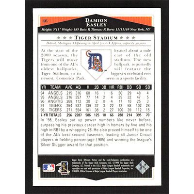 This is a 1999 Ultimate Victory Damion Easley baseball card. The card is #46 and pictures show condition.