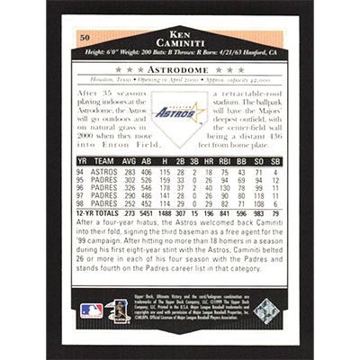 This is a 1999 Ultimate Victory Ken Caminiti baseball card. The card is #50 and pictures show condition.