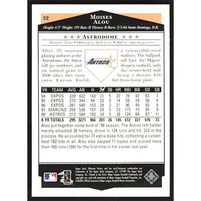 This is a 1999 Ultimate Victory Moises Alou baseball card. The card is #52 and pictures show condition.