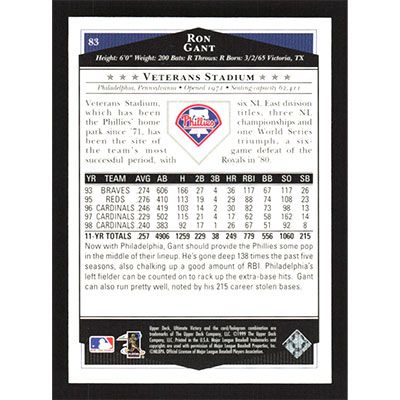 This is a 1999 Ultimate Victory Ron Gant baseball card. The card is #83 and pictures show condition.