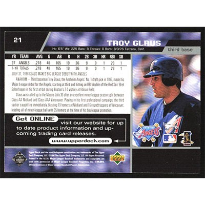 This is a 1999 Upper Deck Troy Glaus baseball card. The card is #21 and pictures show condition.