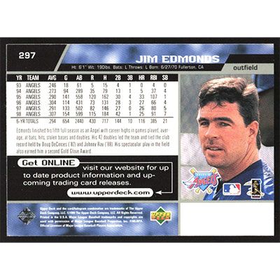 This is a 1999 Upper Deck Jim Edmonds baseball card. The card is #297 and pictures show condition.