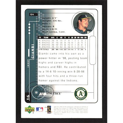 This is a 1999 Upper Deck MVP Jason Giambi baseball card. The card is #154 and pictures show condition.