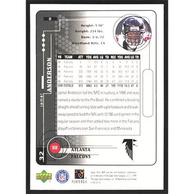 This is a 1999 Upper Deck MVP Jamal Anderson football card. The card is #8 and pictures show condition.