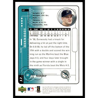 This is a 1999 Upper Deck MVP Todd Dunwoody baseball card. The card is #87 and pictures show condition.