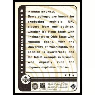 This is a 1999 Upper Deck Retro Throwback Attack Mark Brunell football card. The card is #T9 and pictures show condition.