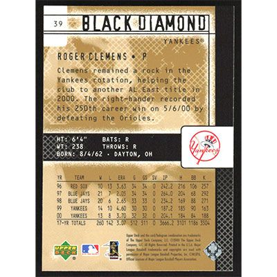 This is a 2000 Black Diamond Rookie Edition Roger Clemens baseball card. The card is #39 and pictures show condition.