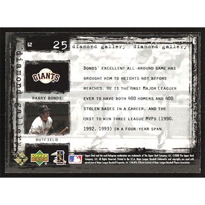 This is a 2000 Black Diamond Rookie Edition Diamond Gallery Barry Bonds baseball card. The card is #G2 and pictures show condition. Team(s): San Francisco Giants