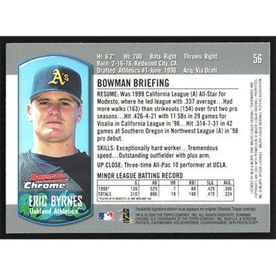 This is a 2000 Bowman Chrome Draft Eric Byrnes baseball card. The card is #56 and pictures show condition.