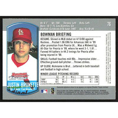 This is a 2000 Bowman Chrome Draft Justin Brunette baseball card. The card is #76 and pictures show condition. Team(s): St. Louis Cardinals Rookie Card (RC)