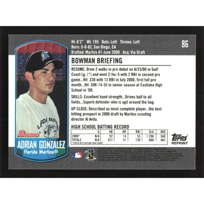 This is a 2000 Bowman Chrome Draft Adrian Gonzalez baseball card. The card is #86 and pictures show condition. Team(s): Florida Marlins Rookie Card (RC)