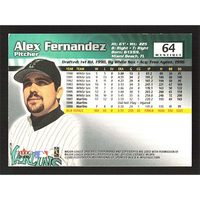 This is a 2000 Fleer Mystique Alex Fernandez baseball card. The card is #64 and pictures show condition.