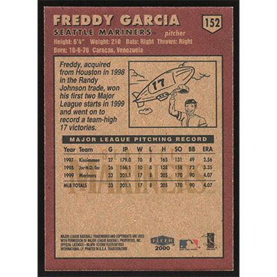 This is a 2000 Fleer Tradition Freddy Garcia baseball card. The card is #152 and pictures show condition.