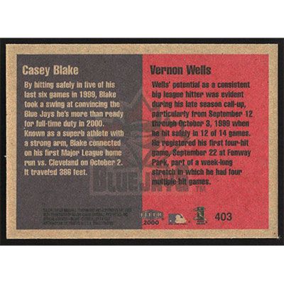 This is a 2000 Fleer Tradition Casey Blake and Vernon Wells Prospects baseball card. The card is #403 and pictures show condition. Team(s): Toronto Blue Jays